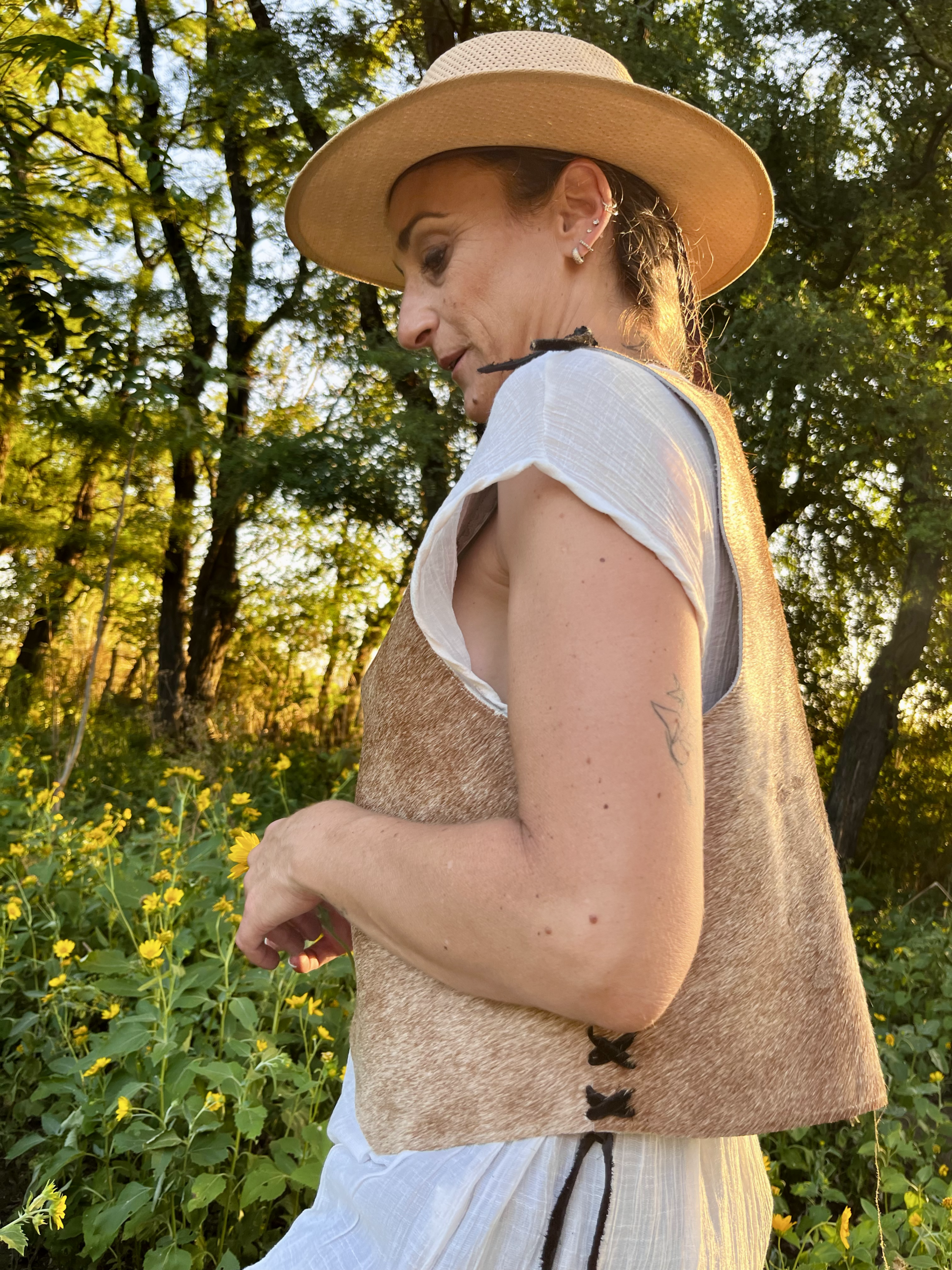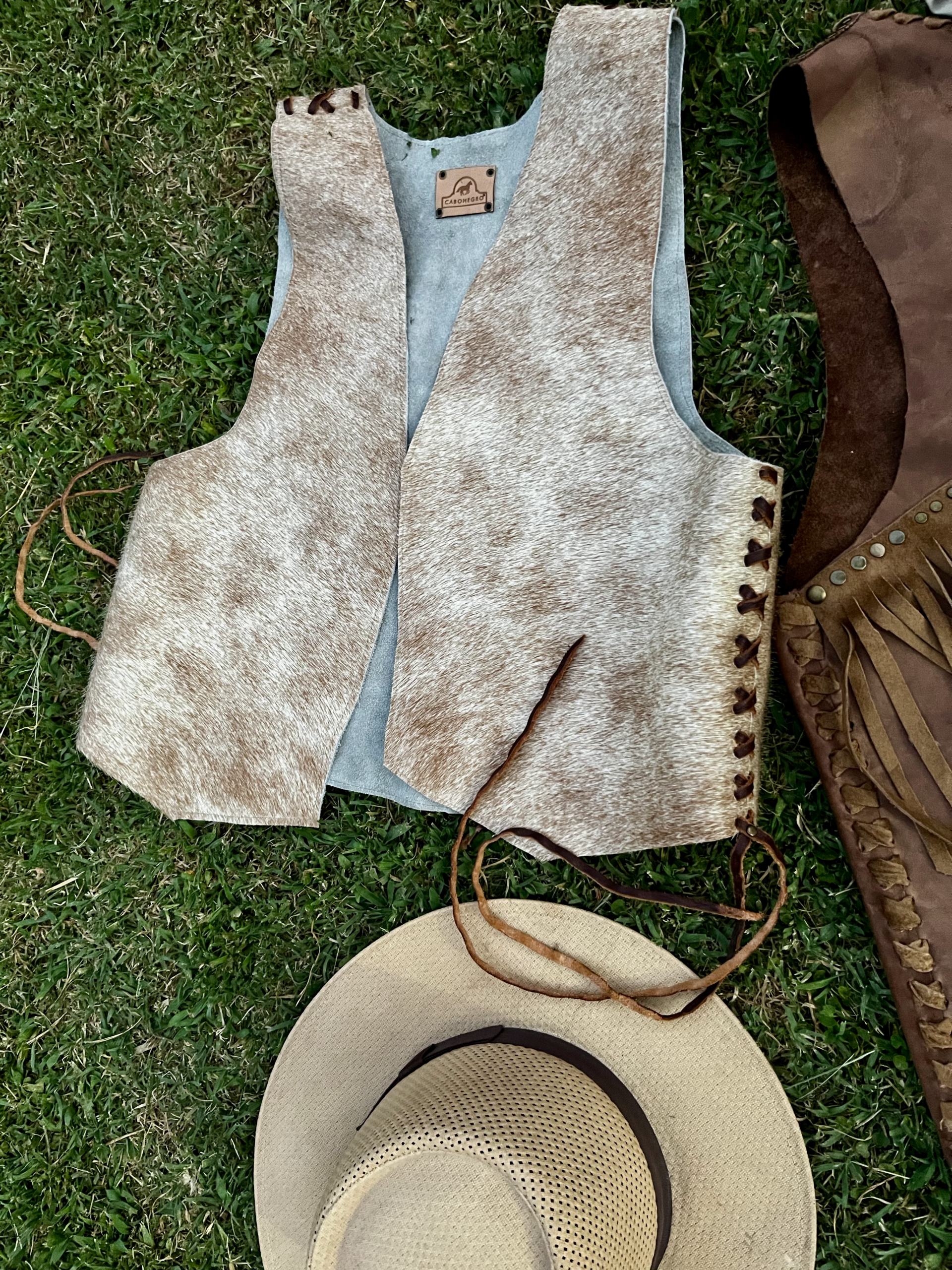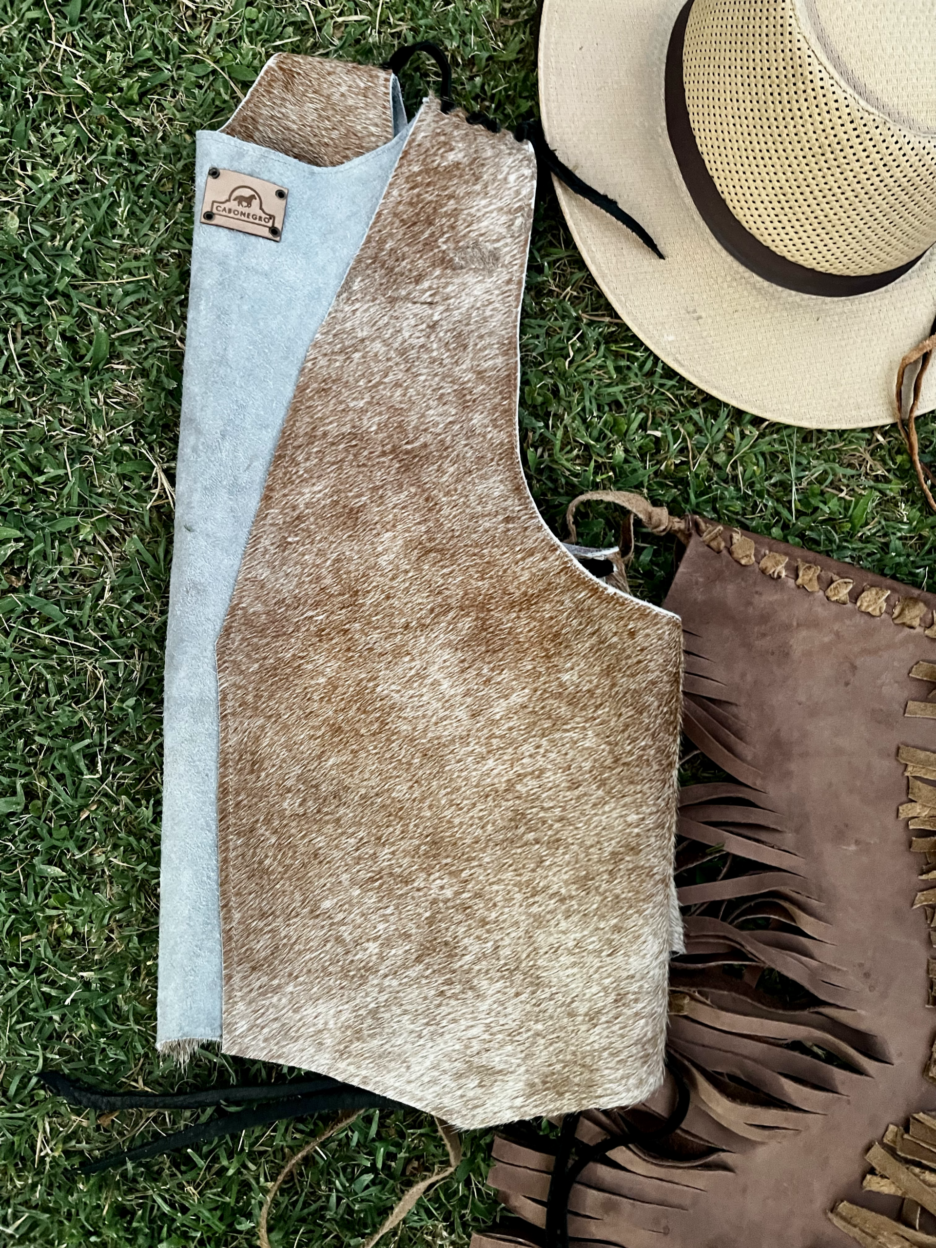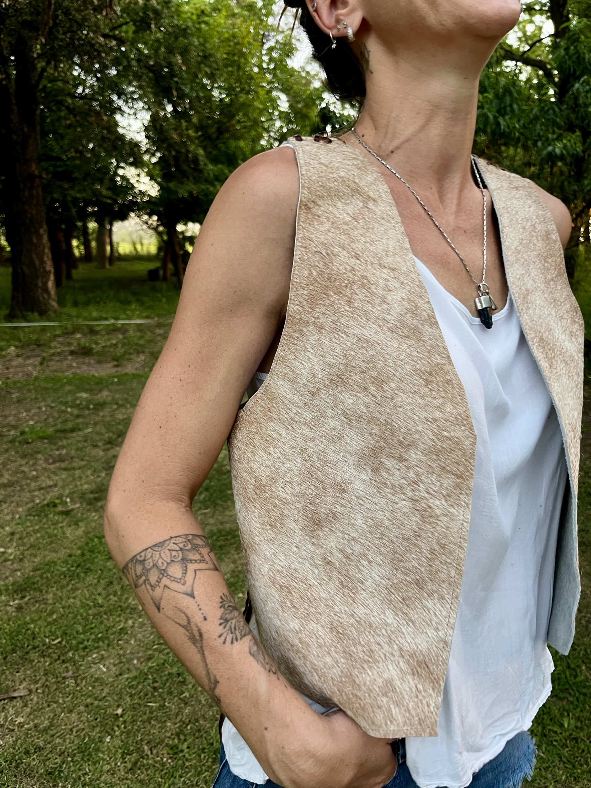 Chaleco de cuero de vaca con pelo en tono bayo, confeccionado de manera 100% artesanal. Cada pieza es única gracias al dibujo natural del pelo, que no se repite.