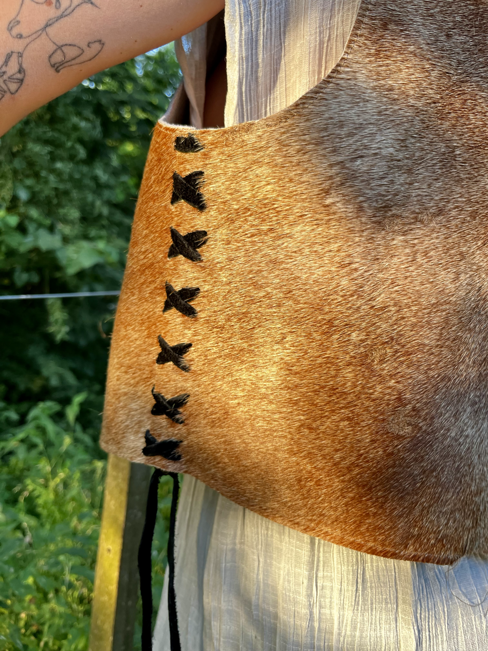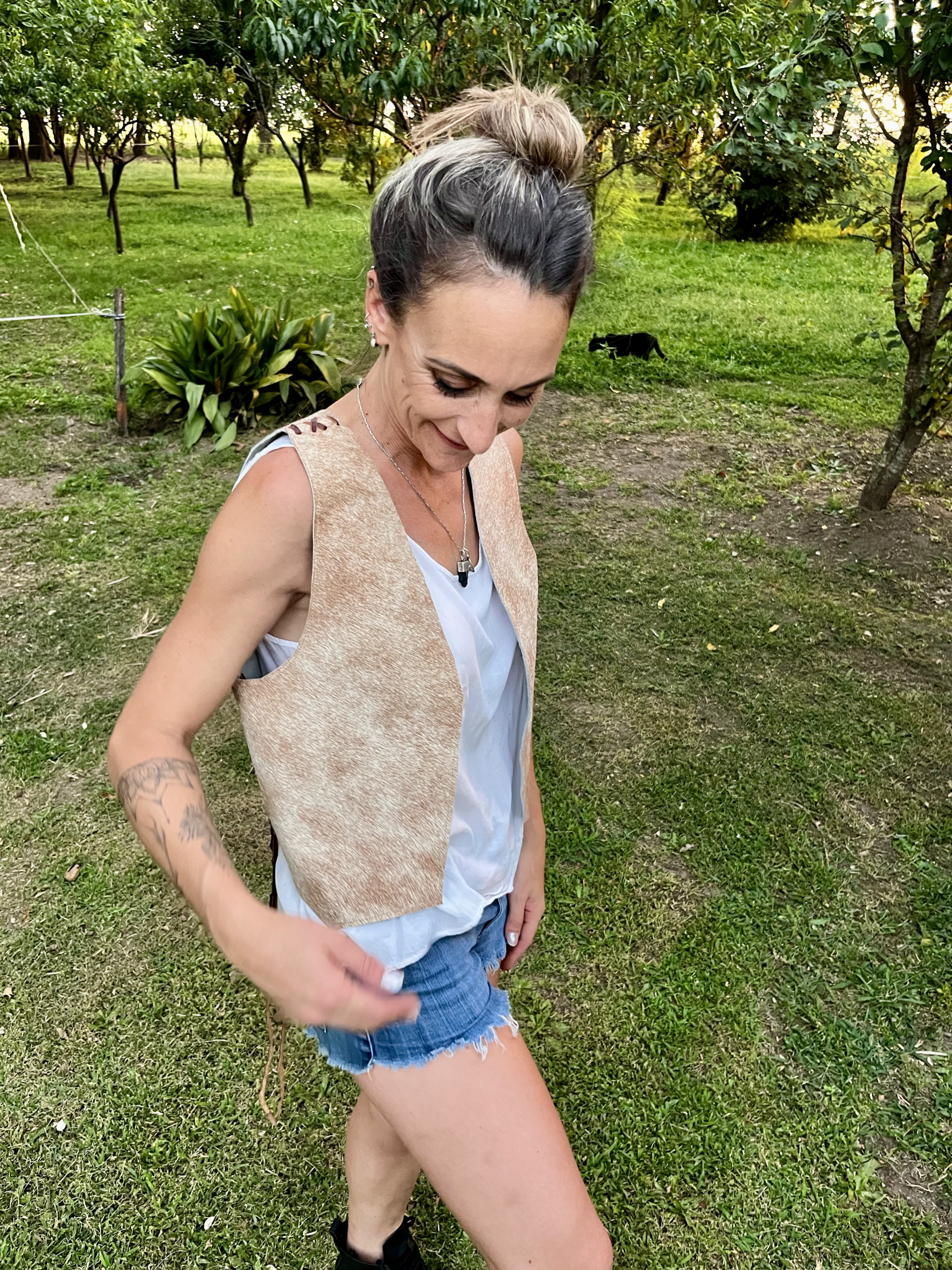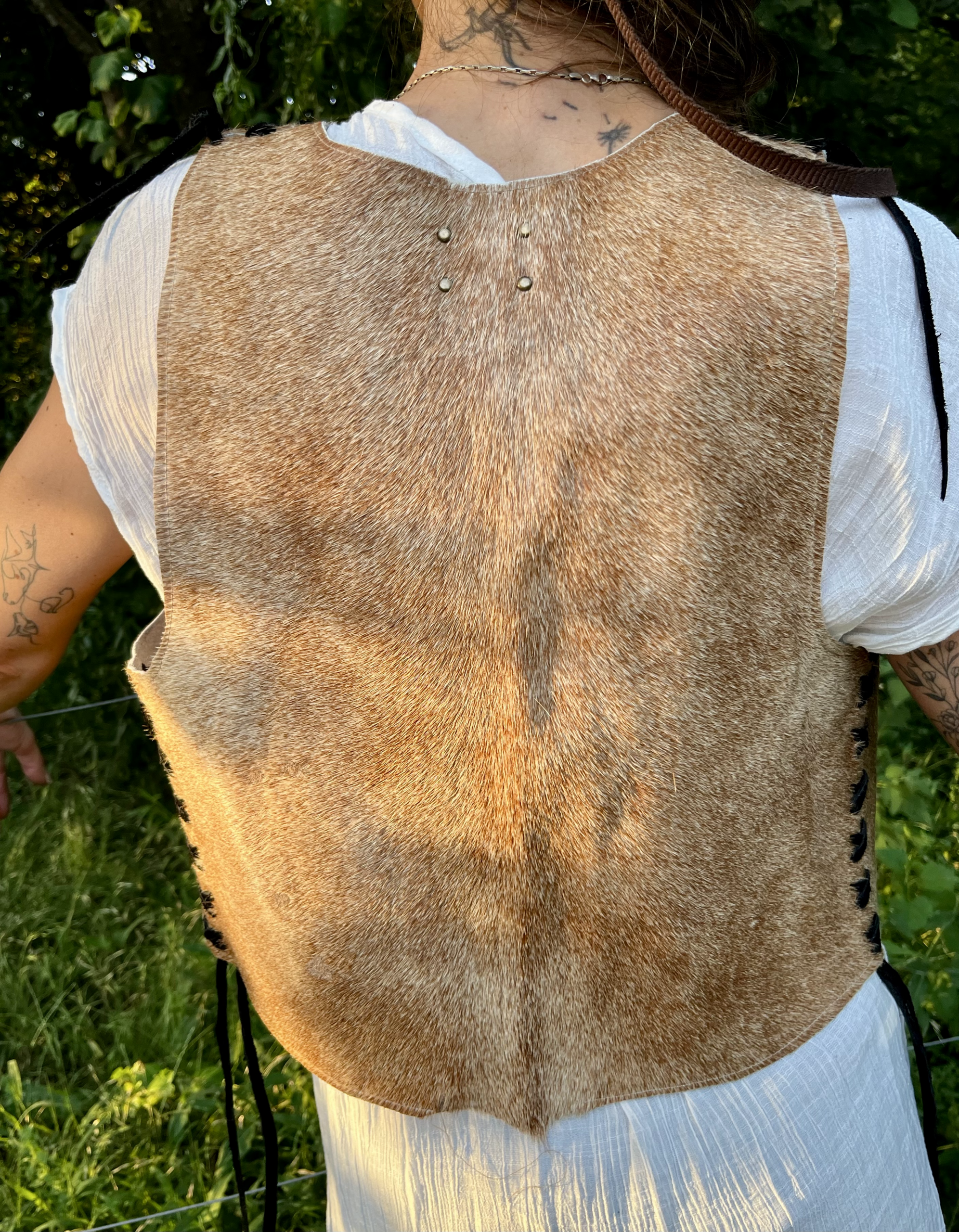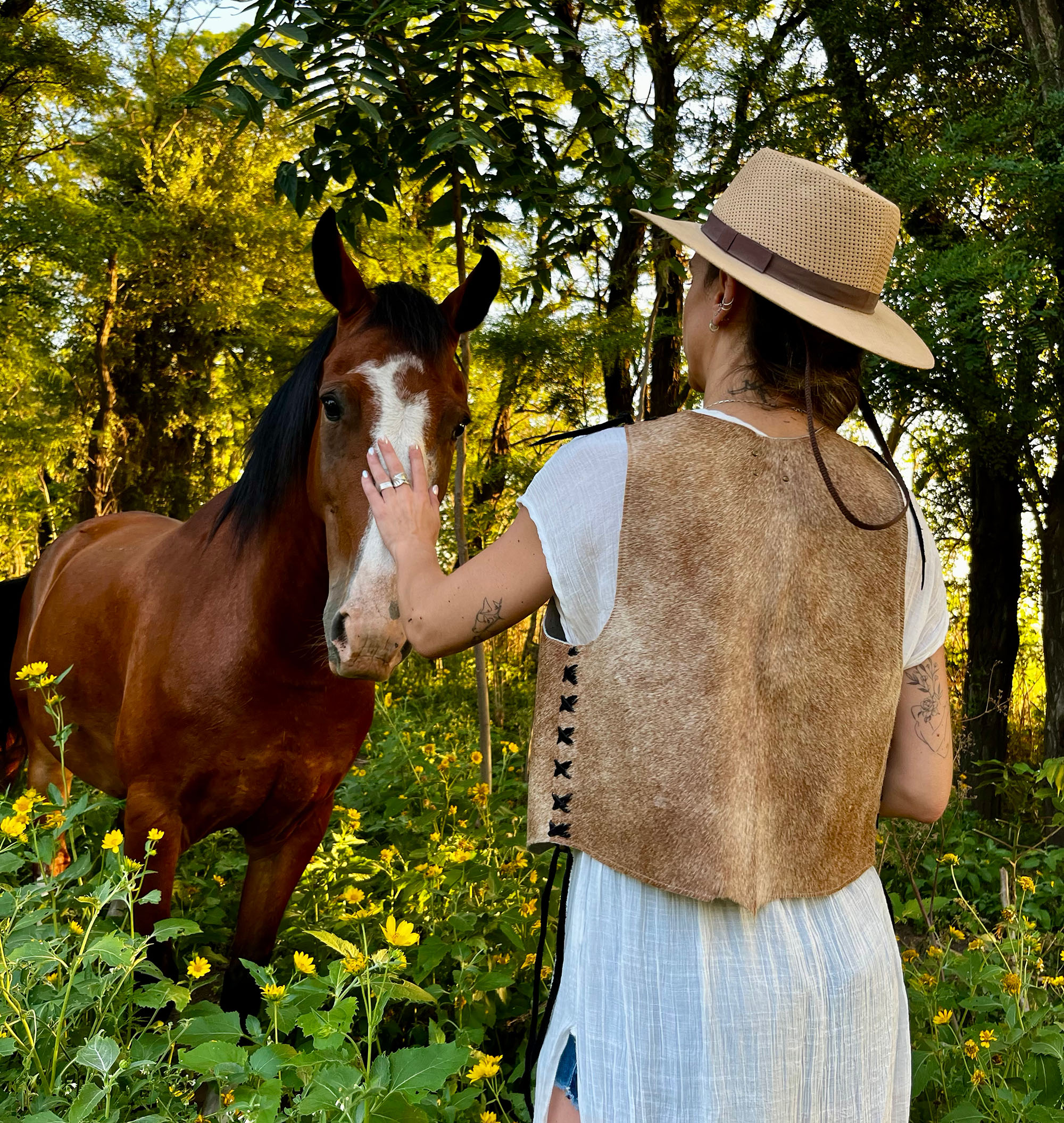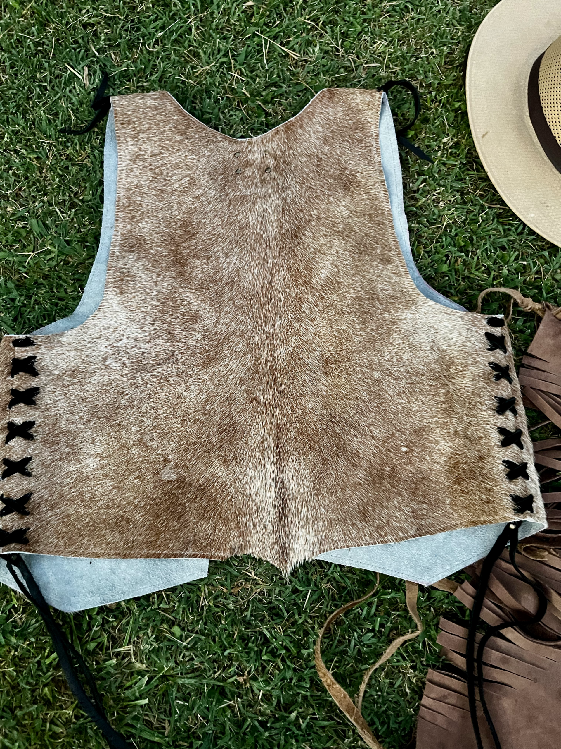 Chaleco de cuero de vaca con pelo en tono bayo, confeccionado de manera 100% artesanal. Cada pieza es única gracias al dibujo natural del pelo, que no se repite.