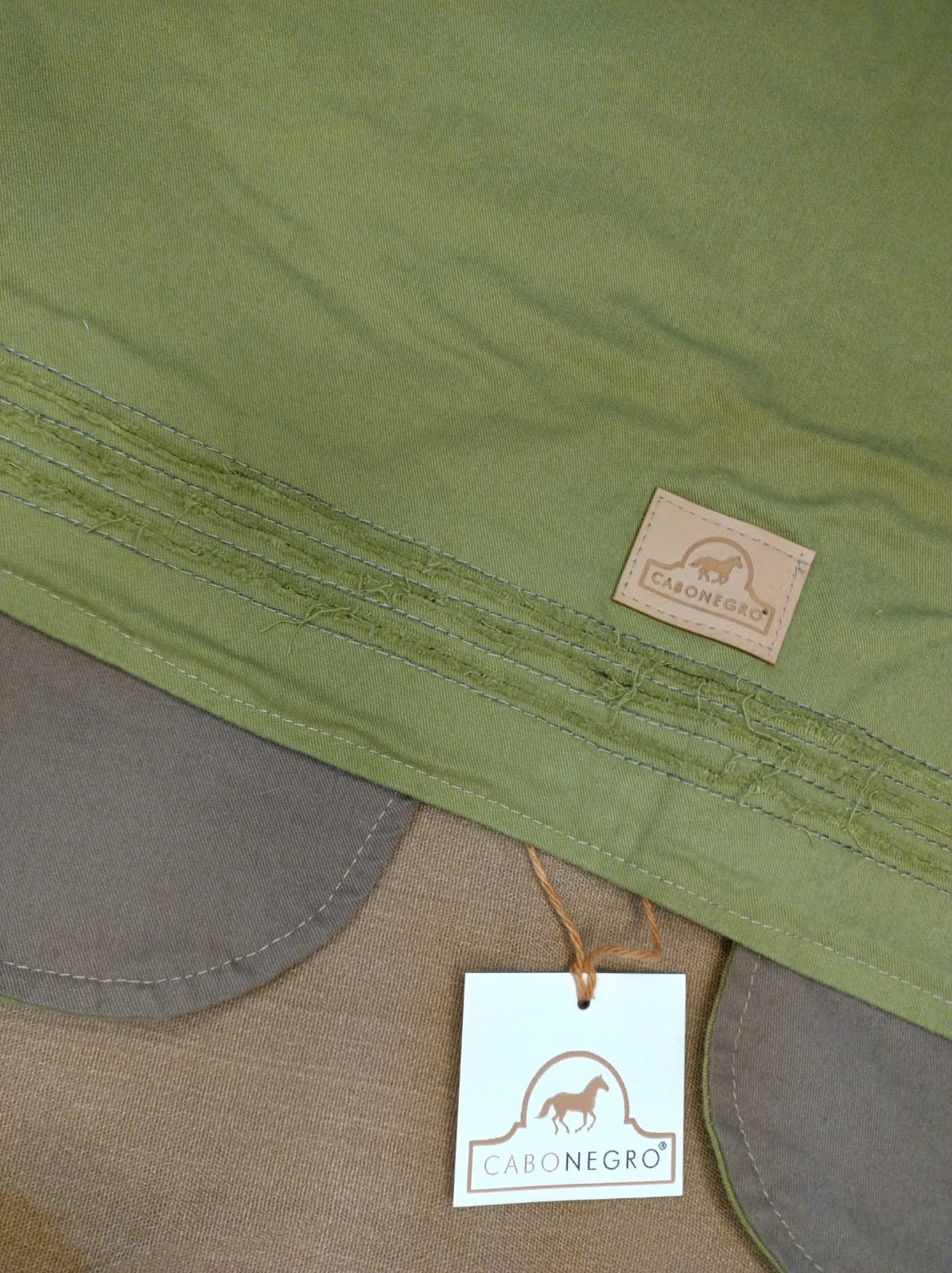 • Detalles: Solapa y espalada verde palta, con detalle de recorte deflecado con fondo visón. Revés color visón liso.