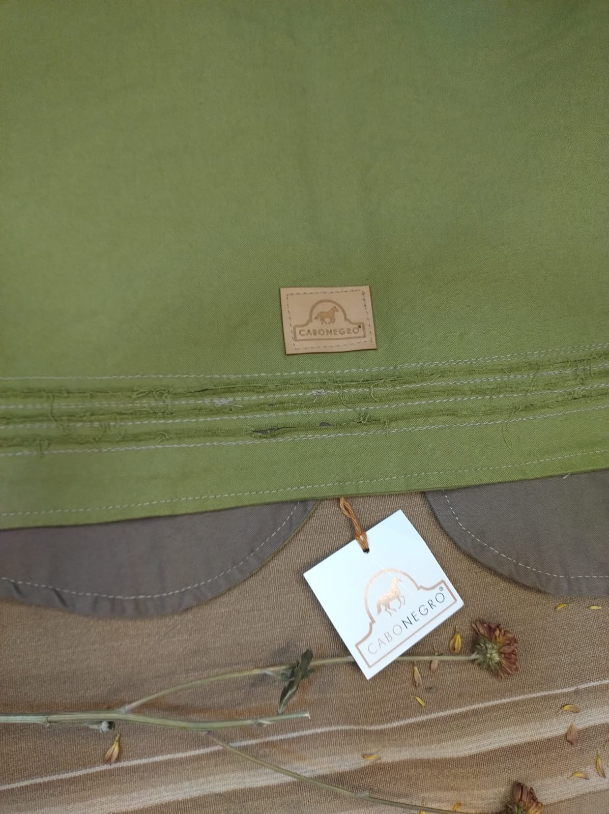 • Detalles: Frente de solapas y espalda color verde palta, con detalle de corte deflecado con fondo visón. Revés espalda verde palta y solapas color visón.