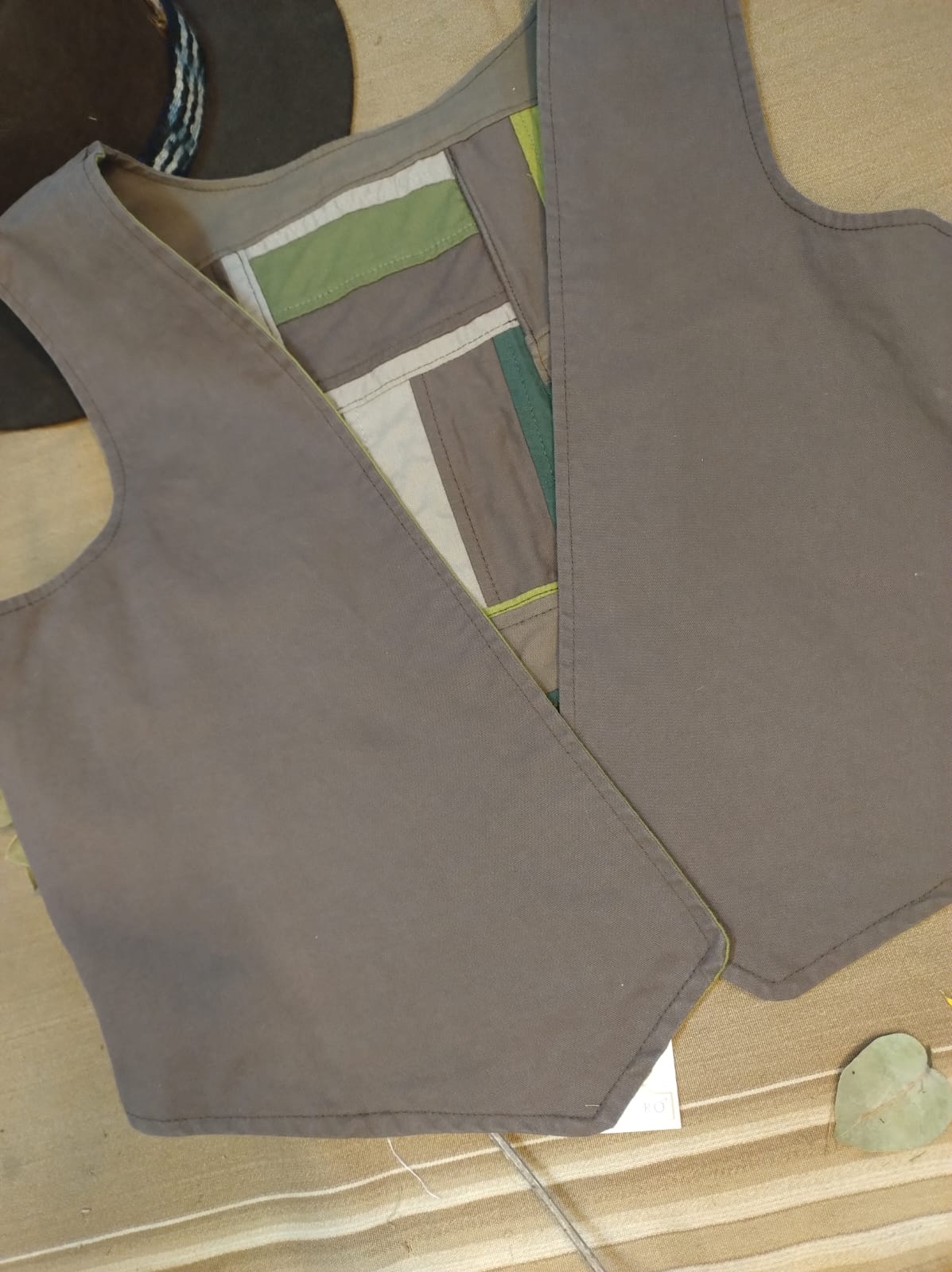 • Detalles: Espalda de recortes estilo patchwork combinada, solapa verde palta. Reves espalda color visón con unión de recortes horizontales en el tono, solapas color chocolate.